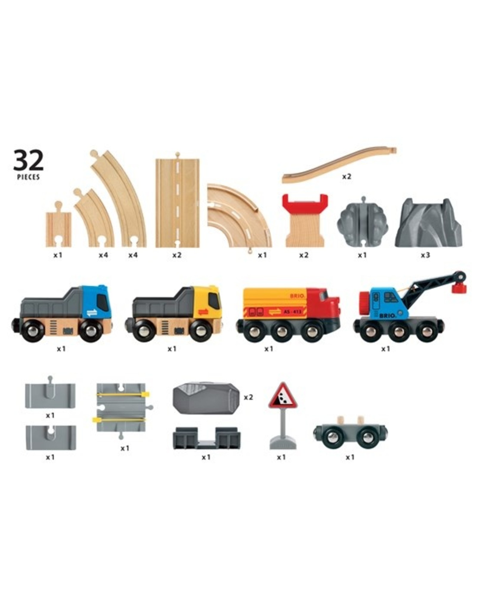 It’s time for some heavy lifting. This 32-piece Rail & Road Loading Set is packed with construction themed vehicles including a portable crane wagon and 2 functioning tipper trucks. Take the action to multiple heights using the railway track supporters and connect up to the roads with the railway crossing for a full BRIO World experience.