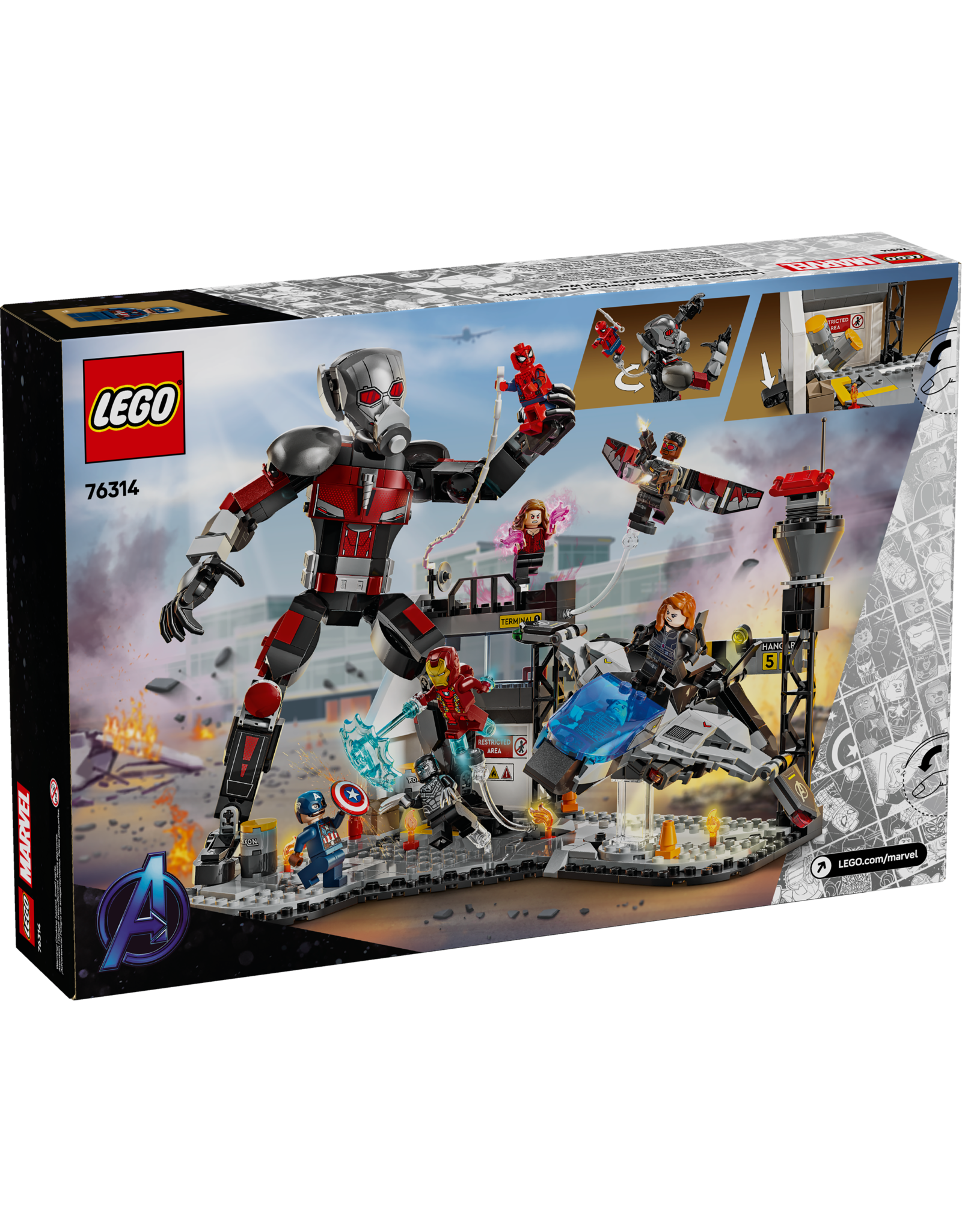 Bring the airport battle scene from Marvel Studios’ Captain America: Civil War to life with one team of Super Heroes – Iron Man, Spider-Man, Black Widow and Black Panther – in an epic showdown with another team of Super Heroes – Captain America, Winter Soldier, Wanda, Falcon and Ant-Man. With Ant-Man towering over the airport and the Quinjet flying up to join him, get ready for mega action!